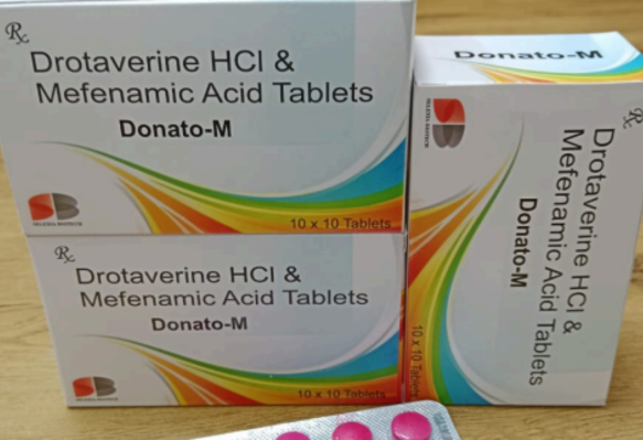 Drotaverine HCl & Mefenamic Acid Tablets combine drotaverine, an antispasmodic that relieves smooth muscle spasms, with mefenamic acid, a nonsteroidal anti-inflammatory drug (NSAID) that reduces pain, inflammation, and fever. This combination is often used to alleviate abdominal pain and cramps, particularly those associated with menstruation or other conditions involving smooth muscle spasms. 1