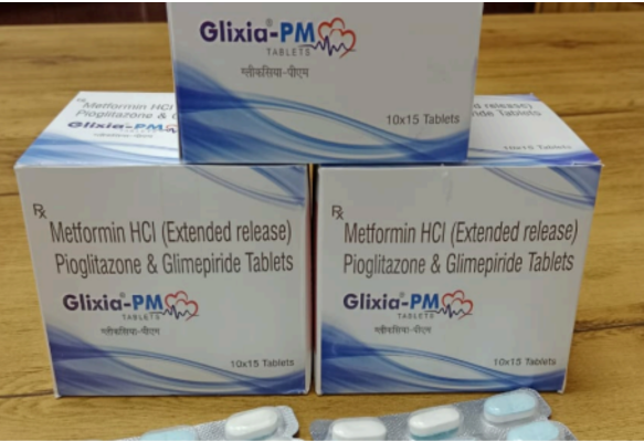 Glixia-PM tablets contain a combination of metformin (extended release), pioglitazone, and glimepiride, three medications used to manage blood sugar in type 2 diabetes by different mechanisms.