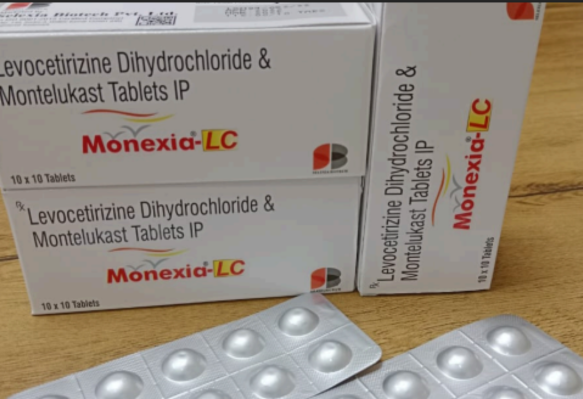 Monexia-LC tablets combine levocetirizine (antihistamine) and montelukast (leukotriene receptor antagonist) to relieve allergy and asthma symptoms by targeting different inflammatory pathways.